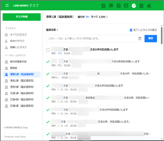 檢查員需處理的客戶詢問,已透過任務管理功能在部門內進行共享與管理。接到電話的事務人員會先登錄客戶編號與需求內容,並轉交至指定負責人處理,使整個流程從需求提出到完成,都能清楚追蹤、透明管理。
