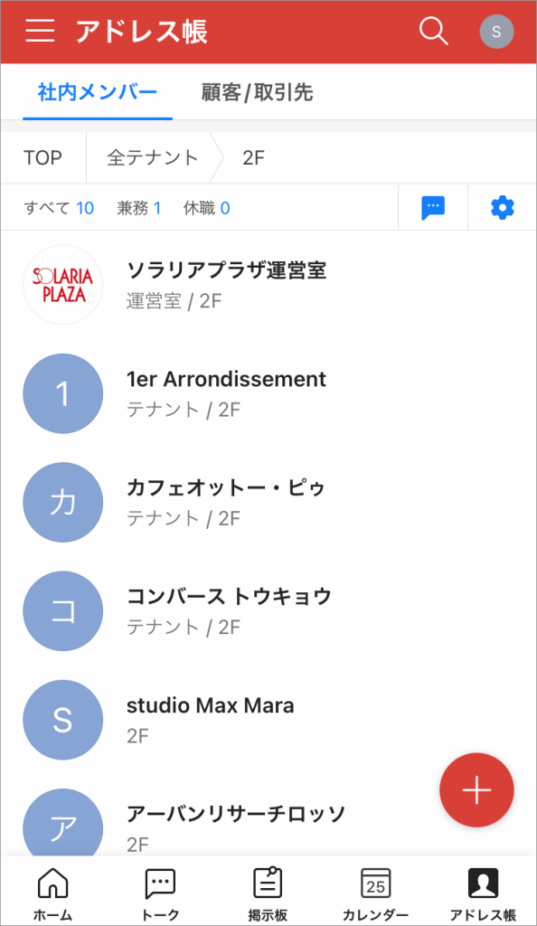 在我們的辦公室,共有13位負責索拉利亞廣場營運管理的員工,且都可以與店家互相聯絡。根據需要,不僅可以與店家個別聯絡,還可以將辦公室的通知一併傳送給包括所有店家的群組。店長之間舉行的會議也以樓層為單位召開,因此除了各個店家的群組之外,還設有各樓層的群組進行溝通。