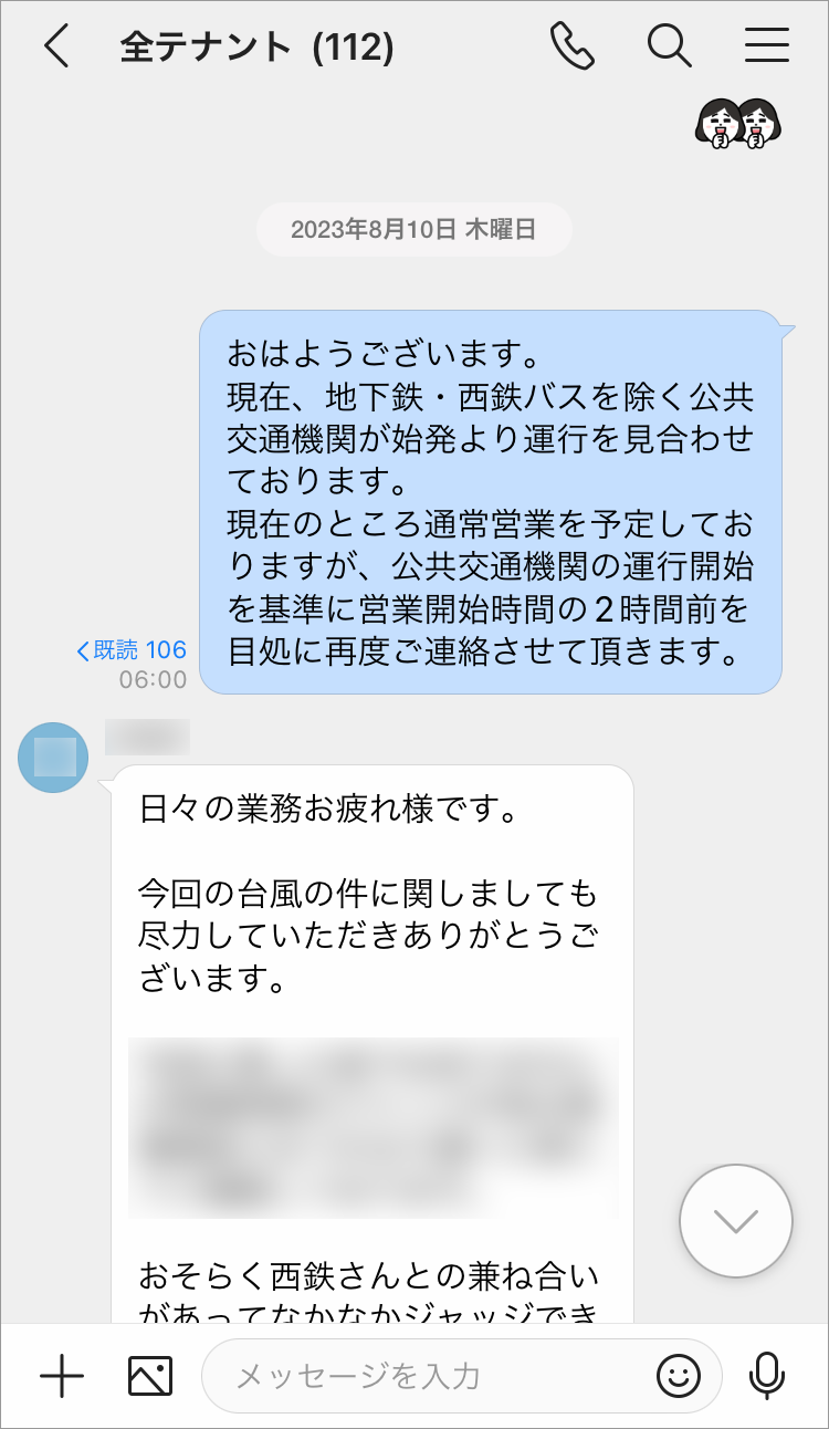在颱風等緊急情況下,辦公室決定暫停營業或縮短營業時間時,以前會向店家負責人傳送電子郵件或簡訊。辦公室的負責人需要到辦公室,用公司的電腦傳送郵件,針對沒有回信的店家還要逐一打電話確認。但現在使用LINE WORKS,辦公室負責人在家也能透過手機輕鬆傳送訊息。此外因為可以確認已讀或未讀,只要針對未讀的店家負責人確認,就可以更有效率的進行聯絡。