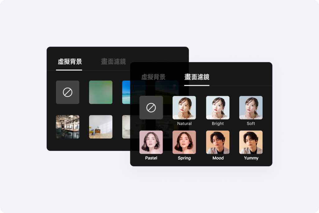 打造專業視訊畫面!可自由切換虛擬背景或套用濾鏡,讓畫面更聚焦、氣氛更出色。