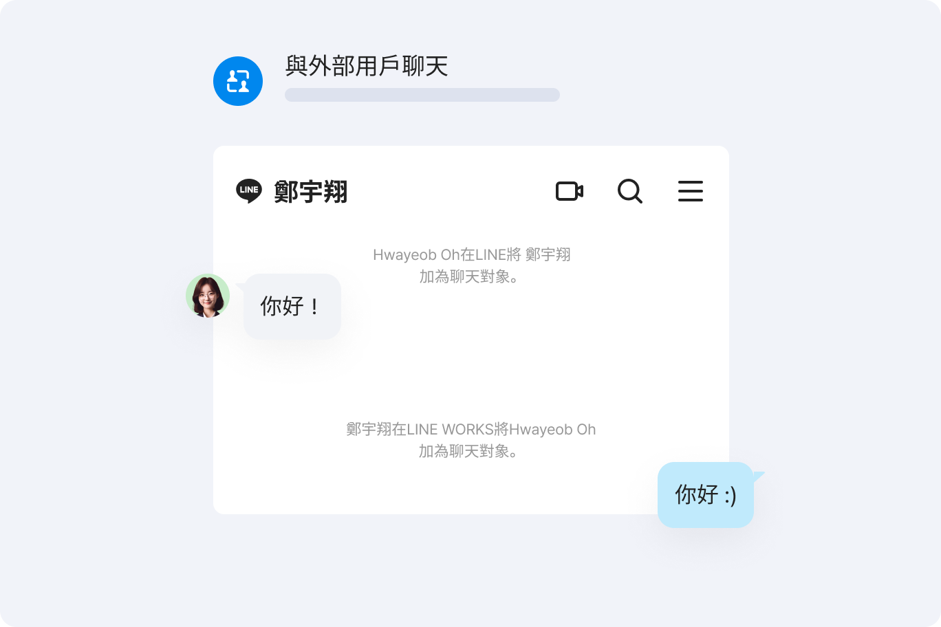 即使對方非同一公司成員,只要是LINE WORKS用戶,也能一同參與語音或視訊會議。