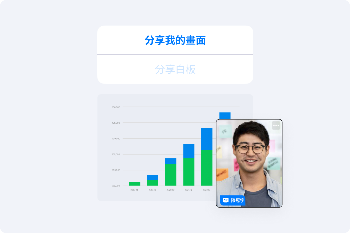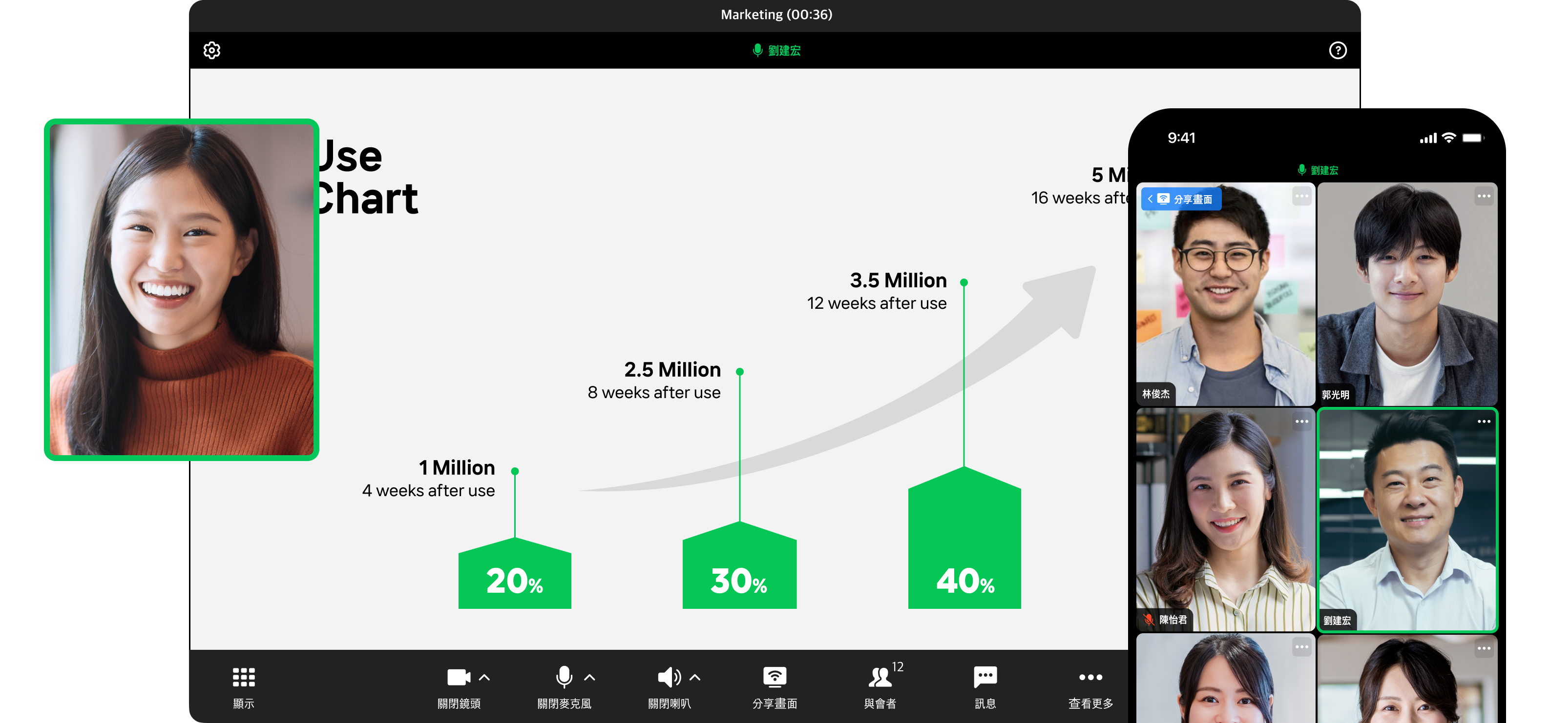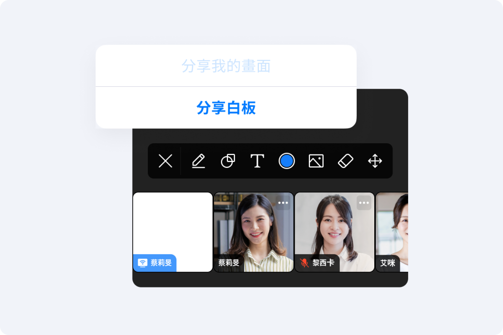 在視訊會議中,您可自由選擇並分享畫面。行動裝置亦支援與電腦相同的所有功能,