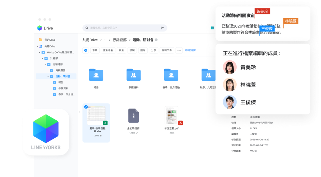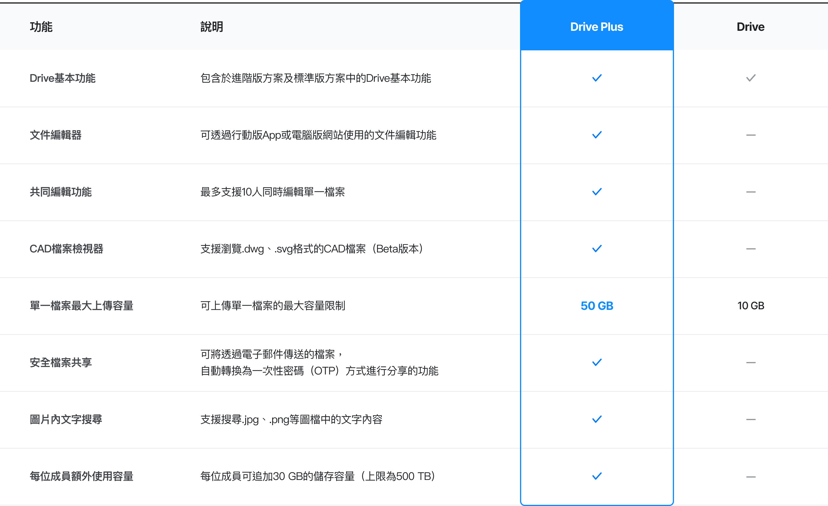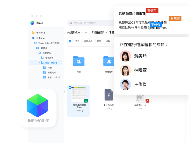 讓團隊協作變得更高效-Drive Plus 讓團隊協作變得更高效 Drive Plus 專為提升Drive使用效率與便利性所打造的附加產品 Drive Plus產品特色 以下所有功能皆可於LINE WORKS平台上使用,未來也將持續推出更多實用功能! 透過Drive,輕鬆實現多人即時共同編輯 可直接於Drive介面編輯各類檔案,即使身處不同地點,也能安全地檢視與修改內容! 支援多人共同編輯,有效提升團隊協作效率。 支援多種檔案格式 內建全新的檔案檢視功能,可直接預覽包含*CAD檔案在內的各類檔案。 同時支援大容量檔案上傳,適合需要處理圖片資料的用戶使用。 *CAD檔案檢視器目前將以Beta版提供 完整支援Drive基本功能 儲存於Drive的資料可與LINE WORKS的訊息、Note、佈告欄等功能無縫串接。 不僅可於電腦上使用,也能在外出或工作現場透過手機或平板,隨時隨地輕鬆存取重要資料。 功能詳情 Drive Plus的各項功能說明 * 若欲透過行動裝置、平板電腦使用部分功能時,需安裝Drive專用App(免費)。 Drive專用App下載頁面請參閱此處 使用智慧型手機時,透過App更加方便! 立即下載App,享受更完整的Drive功能 ・支援Android 10.0以上版本及iOS 16以上版本。