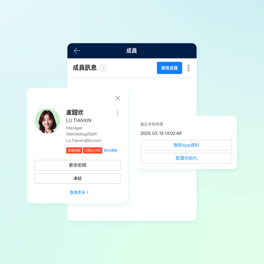 透過監控管理者或成員在LINE WORKS上的操作,從而避免造成資安風險的服務使用。並且,針對裝置或帳號資訊遺失等可能導致資訊外洩的人為疏失,也能迅速應對處理。