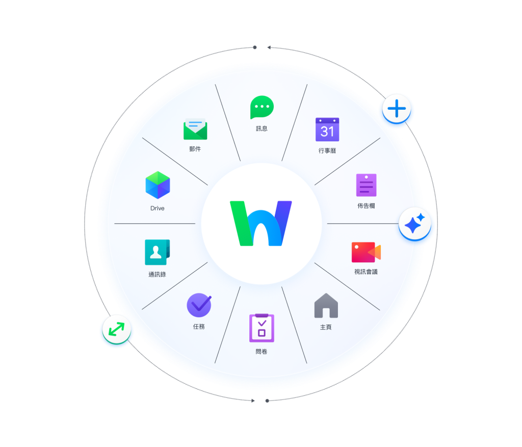 除了聊天、郵件與通訊錄之外,還有公司內部專用的電子佈告欄、可掌握成員行程的行事曆、可隨時隨地儲存/瀏覽資料的雲端硬碟(Drive),以及公司內部和外部的問卷調查等實用功能,全部整合於一個應用程式裡。