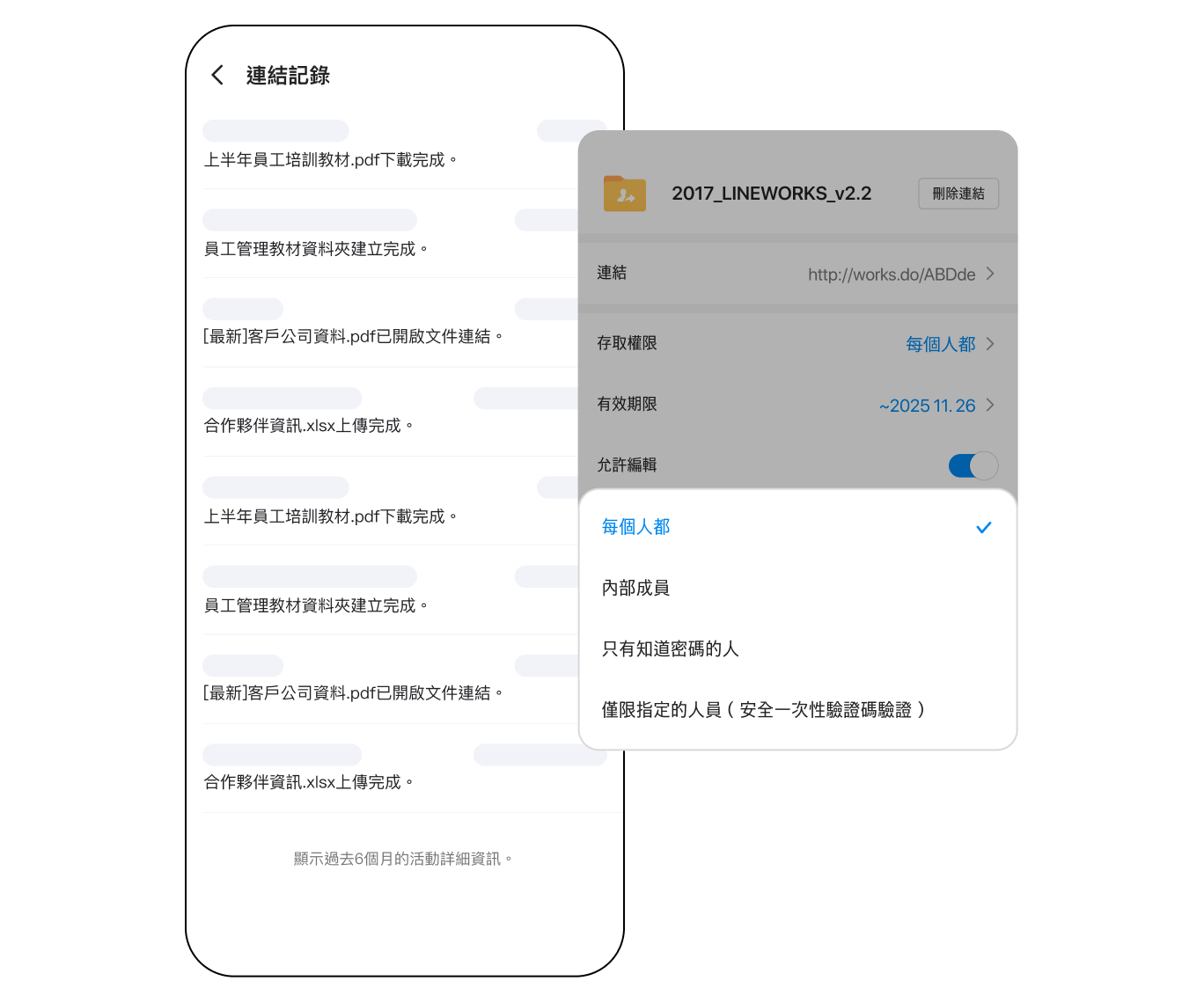 LINE WORKS透過條件式限制檔案存取,或以密碼限制存取等服務,